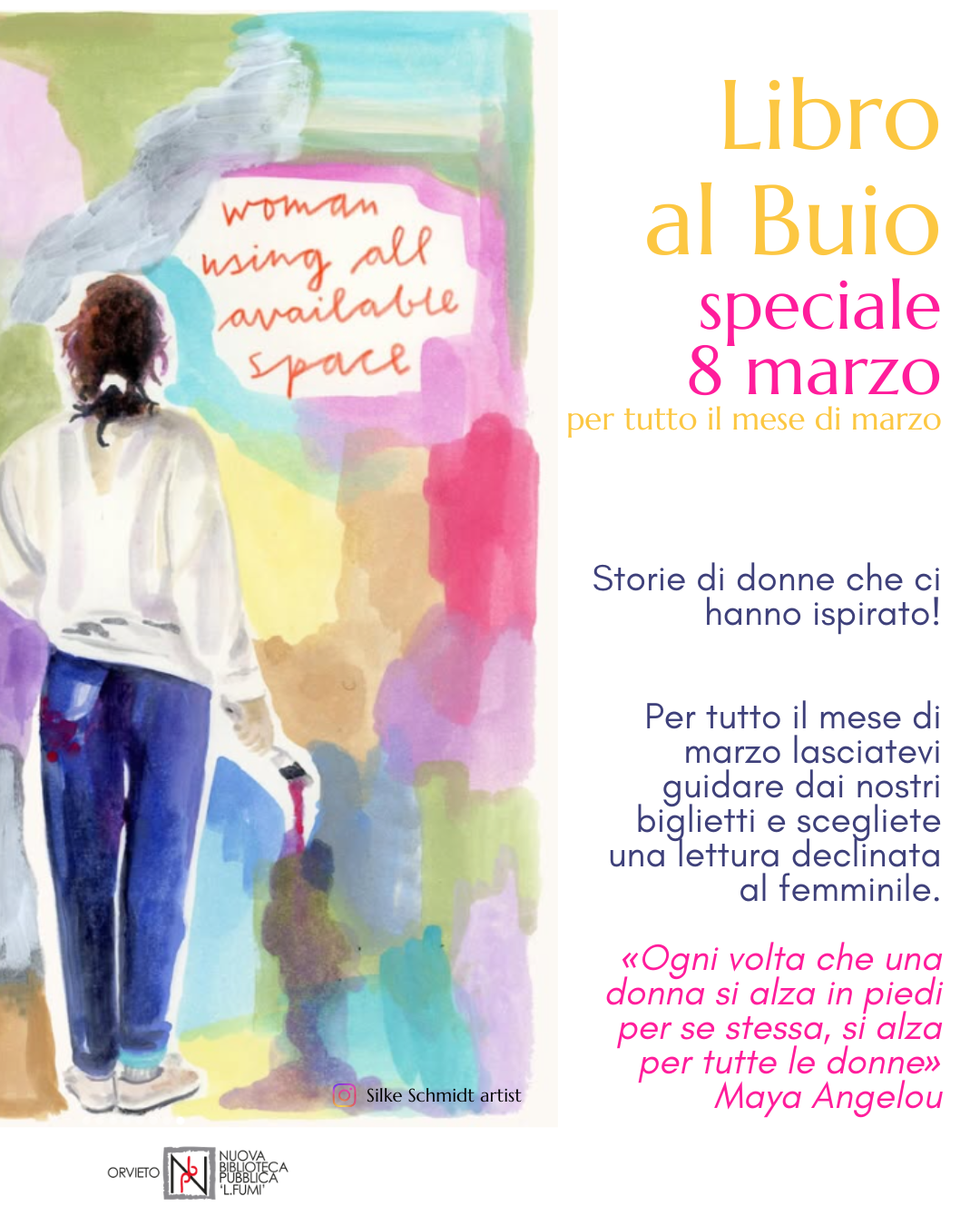 La frase della poetessa statunitense Maya Angelou - «Ogni volta che una donna si alza in piedi per sé stessa, si alza per tutte le donne» - accompagna l'iniziativa promossa dall'assessorato alla Cultura del Comune di Orvieto in collaborazione con l'assessorato alle Politiche giovanili che si inserisce tra le azioni e le proposte culturali della biblioteca legate alla prospettiva e alla differenza di genere. Tra queste non solo l'incremento annuale del patrimonio librario ma anche le proposte didattiche rivolte alle scuole del territorio, le attività del progetto "Nati per leggere" e degli altri progetti specifici che la biblioteca porta avanti, come ad esempio quello legato alla raccolta di testimonianze e memorie orali.