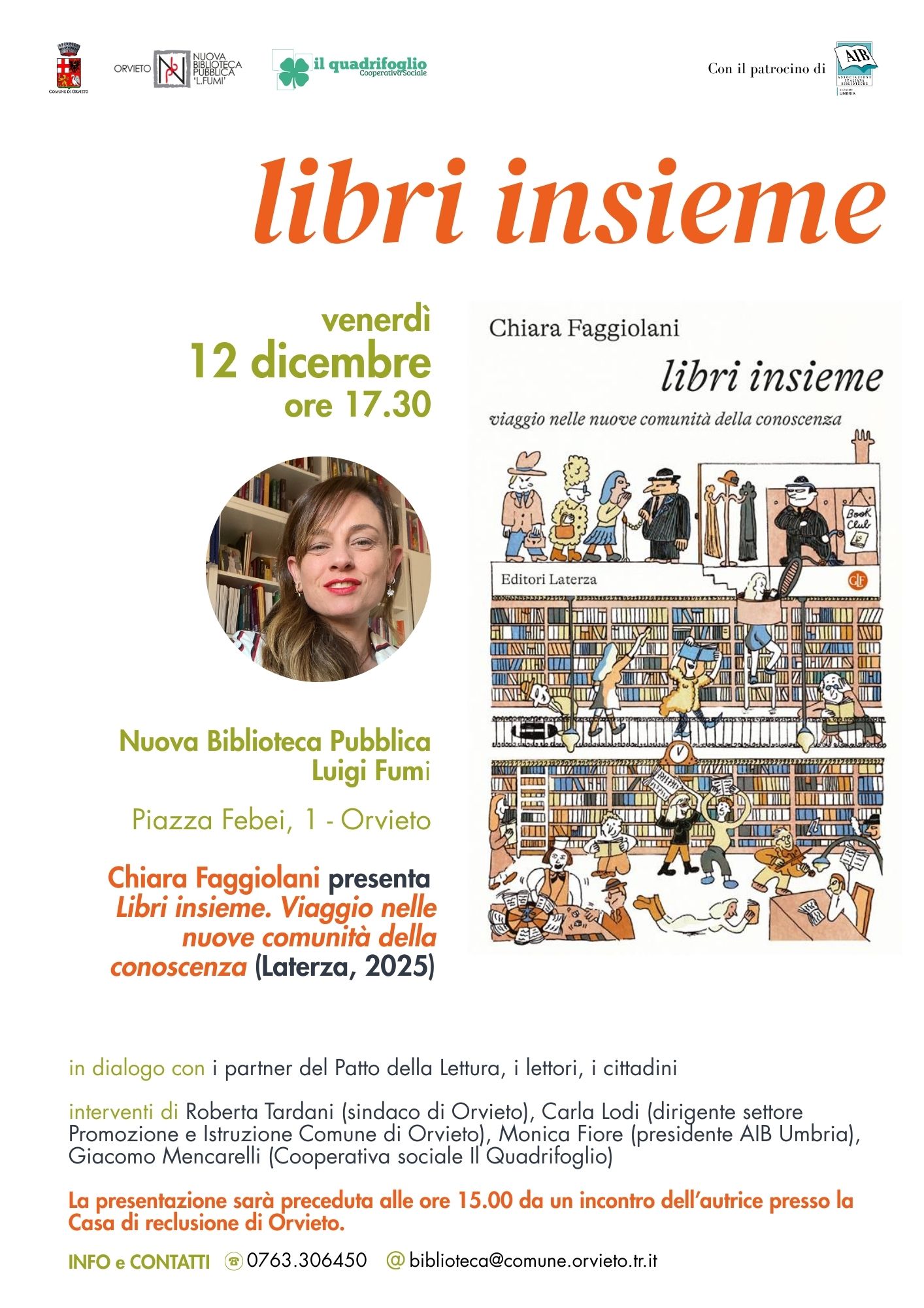 L’appuntamento sarà aperto dagli interventi del sindaco di Orvieto e assessore alla Cultura, Roberta Tardani, di Carla Lodi, dirigente Settore Promozione e Istruzione del Comune di Orvieto, di Monica Fiore, presidente AIB Umbria, e Giacomo Mencarelli della cooperativa sociale Il Quadrifoglio.