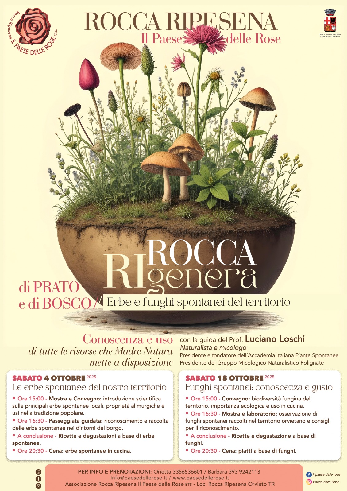 ORVIETO - "Rocca Rigenera", è questo il titolo della nuova iniziativa organizzata dall'associazione "Il Paese delle Rose" a Rocca Ripesena con il patrocinio del Comune di Orvieto. Due gli appuntamenti in programma, sabato 4 ottobre e sabato 18 ottobre, che approfondiranno la conoscenza su erbe spontanee e funghi spontanei. Con la guida del professor Luciano Loschi, naturalista e micologo, presidente e fondatore dell’Accademia Italiana Piante Spontanee e presidente del Gruppo Micologico Naturalistico Folignate, verranno proposti momenti formativi, passeggiate naturalistiche e degustazioni, per unire sapere scientifico, tradizione e convivialità.